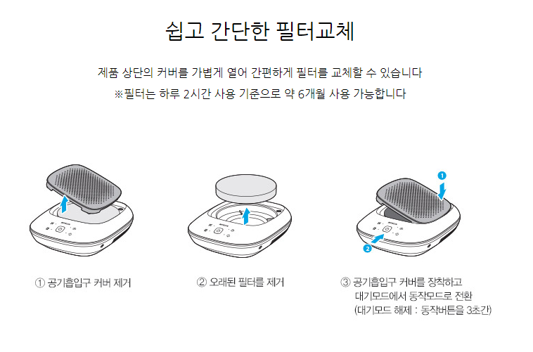 청정기능과 더불어 반드시 확인해야되는 부분이 필터교체 여부입니다. 일부 제품은 필터교체가 안되서 제품을 새로 구입해야되는 경우도 있고, 필터교체가 어렵게 만들어진 제품도 많습니다. 엠피온은 윗 뚜껑만 열고 제 필터만 넣으면 되는 간단한 구조이기에 매우 마음에 들었습니다. 여성분도 충분히 혼자서 할 수 있을 정도이니 걱정하지 않으셔도 될 것 같습니다.