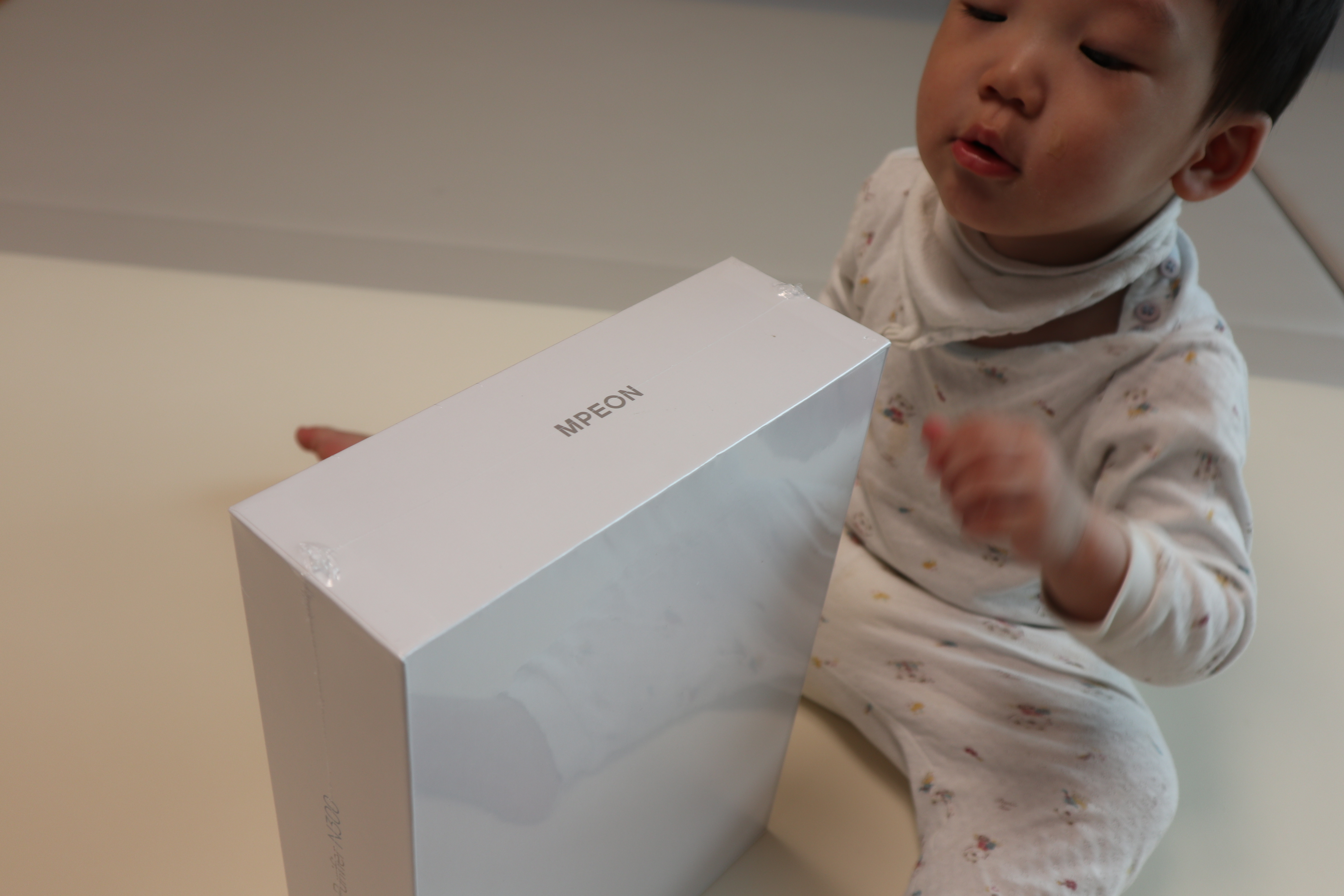 우선 상품포장은 애플의 그것과 매우 유사하게 되어있습니다. 글자없이 박스만 보면 아이패드인줄 착각할 수도 있겠다 싶은 생각이 들더군요. 박스를 좋아하는 우리 아기도 관심을 가지는 표정입니다. 심플하게 간단한 느낌을 물씬 풍기는 박스샷, 흰색으로 되어있어 더 깔끔해 보이네요.